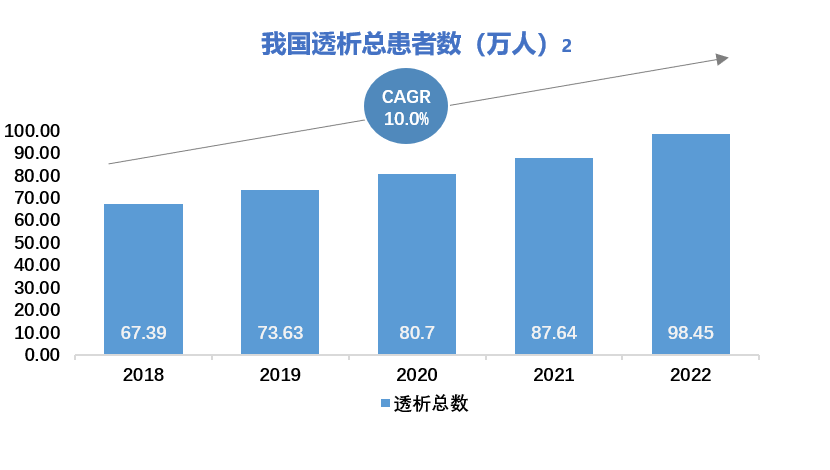研究表明:目前,中國存量透析治療需求仍然遠未被滿足,晚期腎病患者接受透析治療的比例偏低,中國的平均透析治療為每百萬人182人,除北京外,遠低于其他國家和地區,中國當前整體透析治療率不到20%,低于全球平均37%治療率,更是遠低于歐美等發達國家90%的治療率,中國透析需求遠未被滿足,透析市場發展潛力巨大。透析市場是中國最具潛力的藍海市場之一,中投顧問產業研究中心表示,透析服務供給者的增加、大醫保覆蓋范圍擴大、透析材料及器材價格下降等因素將促進透析費用下降,以7萬元的人均年血透費用和5萬元的人均年腹透費用估算,2020年透析市場規模有望達498億元,接近500億元。
